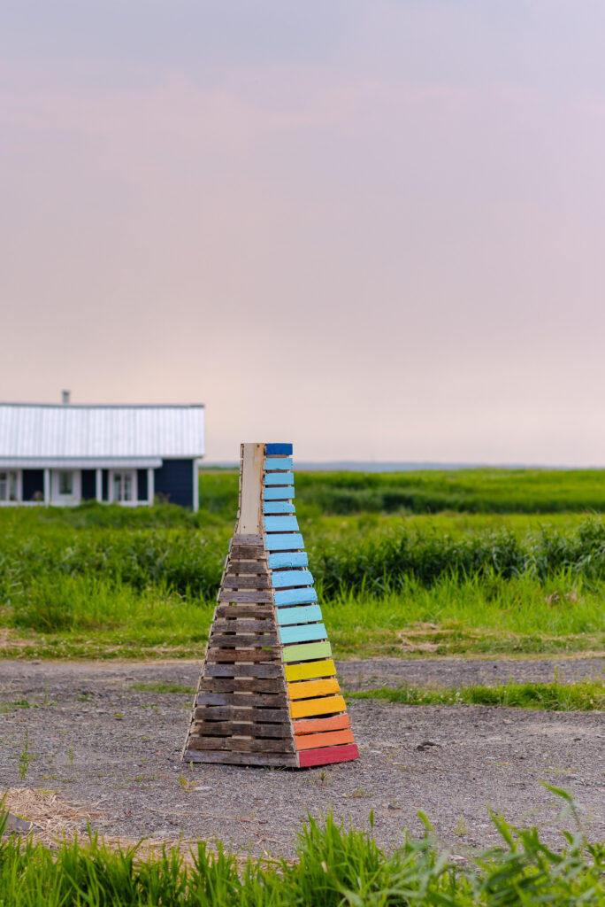 Le projet vise à faire ressurgir les récits et les formes de vie liés aux paysages construits du Kamouraska, en mettant en lumière des structures humaines fragilisées ou en disparition. À travers une approche transgénérationnelle et contextuelle, La Famille Plouffe utilise l’art pour renouer avec le territoire par des gestes simples, porteurs de mémoire. Les formes et couleurs déployées — notamment des dégradés inspirés du ciel — sont appliquées à divers éléments du paysage aménagé : ces gestes picturaux cherchent à mettre en valeur ces structures propres au lieu et à révéler leur pouvoir évocateur en plaçant le paysage au cœur de chaque intervention.
